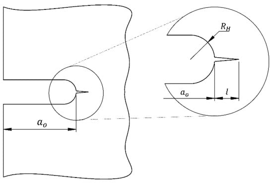 where is the notch radius, is the crack length measured from the notch root (as shown in Figure 5), and is the stress intensity factor without the effect of the drilled hole geometry. The reversed plastic zone is estimated replacing from Equation (6) into Equation (5) and then replacing by from Equation (3), giving: