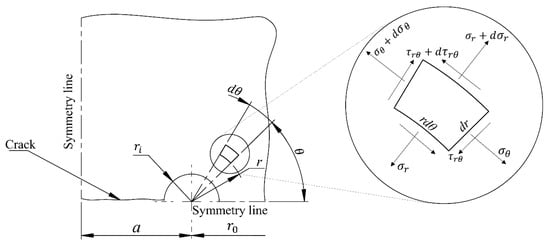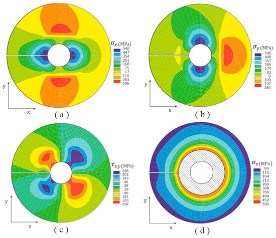The local stress fields are presented in Figure 10, where the von Mises stress, depicted in Figure 10d, is employed to identify the plastic zone, which occurs when (The von Mises stress field shown in Figure 10d only makes sense for the elastic zone; for this reason, a circular dashed zone is superimposed). The variation between the corrected plastic zone size estimated using Equation (16) and the FEM prediction amounts to approximately . Figure 10c reveals that the shear stresses are zero for while the maximum values occur at planes situated at from the horizontal axis.
