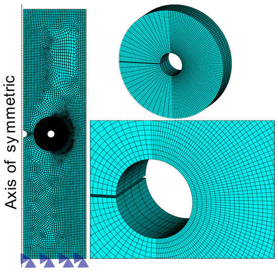 A mesh with 46,240 elements and 59,111 nodes is employed with 14,400 elements and 18,755 nodes around the interference zone and the line along to for (see Figure 7) to accurately capture the size of the plastic zone , which occurs when the von Mises stress reach the yield stress . However, it is necessary to correct the obtained plastic zone for equilibrium considerations since the elastic stress above, , is neglected when is constrained by [46]. To compensate the loss of the stresses above , the plastic zone needs to be increased for [19], as pointed out by T. L Anderson [46]. This is written as is shown in Equation (16):