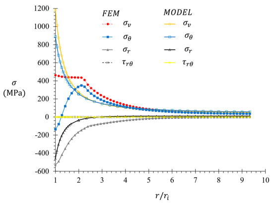 The stress fields ahead of the drilled hole after inserting the pin obtained from the FEM simulation and the analytical solution (, Equation (14)) are plotted in Figure 8, where it can be observed that the solution requires the correction of Equation (16).