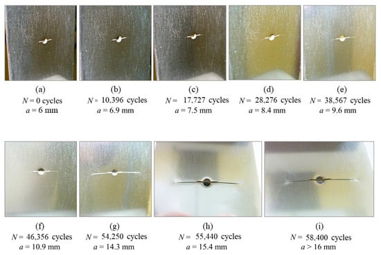 Crack length growing at different numbers of load cycles applied for the base material (a) mm, (b) mm, (c) mm, (d) mm, (e) mm, (f) mm, (g) mm, (h) mm, (i) mm.
