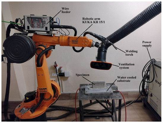 The setup used for the manufacturing of the currently studied specimens is shown in Figure 1. It consists of a robotic arm KUKA KR 15/1 (KUKA GmbH, Augsburg, Germany) combined with a MTR500W PP welding torch (EWM GmbH, Mündersbach, Germany) and a standard four roller type wire feeding unit (EWM GmbH, Mündersbach, Germany). The power supply used in the setup is the EWM Alpha Q 552 pulse MM RC power supply (EWM GmbH, Mündersbach, Germany) suitable for GMAW in the cold arc pulse mode. The specimens are built on a substrate made of Al 6082 T6 with dimensions of 300 × 65 × 15 mm. The substrate is mechanically cleaned with an abrasive paper followed by subsequent sterilization of the surface using 99% isopropyl alcohol. The substrate is placed on a water-cooled block designed to improve the cooling of the specimens during the manufacturing process. During the welding process, a large quantity of aluminum vapors are formed. As it is known, Al is highly toxic for living organisms so an appropriately selected ventilation system must be employed to extract the formed aluminum vapors during the process.