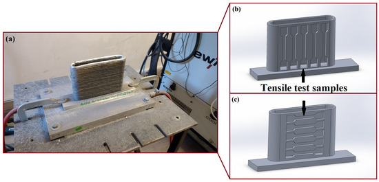 WAAM specimen with a length of 200 mm (a); vertical tensile test samples location (b); and horizontal tensile test samples location (c).