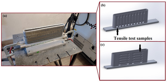 The yield strength (YS), the ultimate tensile strength (UTS), and the elongation (ε) of the specimens were determined by performing tensile tests using a ZwickRoell Vibrophore 100 testing system (ZwickRoell, Ulm, Germany) in a static strain mode. During the tests, samples from both the vertical and horizontal directions of build-up were examined. Figure 2b and Figure 3b show the location of the vertical samples taken from both specimens, and Figure 2c and Figure 3c show the location of the horizontal samples along the surface area of the manufactured components. The tensile strength probes all have a length of 130 mm, a thickness of 5 mm, and a shaft width of 10 mm. The experiments were performed in agreement with the DIN EN ISO 6892-1 standard [26].