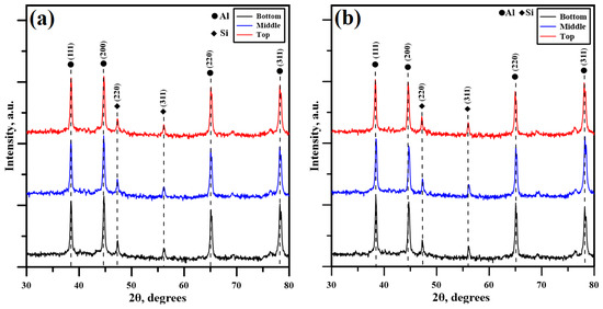 The X-ray diffraction analysis results regarding the bottom, middle, and top samples of both specimens are shown in Figure 4, where Figure 4a corresponds to the L200 specimen, and Figure 4b corresponds to the L400 one. The experimentally obtained diffractograms do not present amorphous-like halos confirming the crystalline structure of the built-up specimens. A double-phase structure consisting of aluminum and silicon phases was observed. This type of configuration is typical for eutectic alloys such as AlSi5 [27]. Aluminum and silicon both have a face-centered cubic (fcc) structure and belong to the Fm3m (225), and the Fd3m (227) space groups, accordingly. Diffraction maxima of the aluminum phase corresponding to the (111), (200), (220), and (311) planes, belonging to {111}, {100}, {110}, and {311} families of crystallographic planes, respectively, were observed. Peaks corresponding to the (220), (311), (400), and (331) planes of the Si phase were also detected.