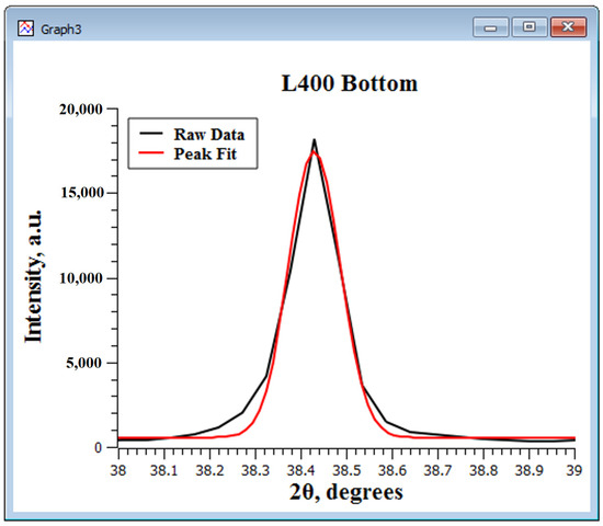 In order to further evaluate the effect of the geometrical size on the crystallographic imperfections (such as dislocations, stacking faults, nanopores, etc.) of the specimens on the resulting structure, the full width at half maximum (FWHM) was determined using a specialized peak fitting software SciDAVis version 2.7. According to the theory of X-ray diffraction, the quantity of the crystallographic imperfections is proportional to the peak broadening, i.e., a higher value of FWHM corresponds to a greater amount of crystallographic imperfections [28]. Figure 5 presents a graphical comparison between the raw data and the resulting peak fit. As an illustration of the accuracy of the fitting model, an aluminum peak was chosen from the data, corresponding to the bottom of the L400 specimen. The shown fit indicates that the FWHM of that particular aluminum peak is 1.108 ± 0.035.