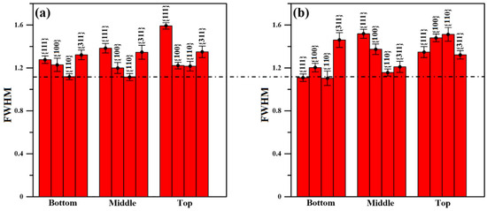 FWHM of the Al phase of the (a) L200 and (b) L400 specimens.