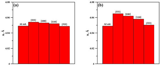 The obtained values were compared to the standardized ones given in the ICDD database for polycrystalline aluminum and silicon samples. The lattice constant of the Si phase remains about the same in the range of 5.430–5.435 Ǻ throughout all experiments regardless of the position of the specimen the sample was taken from, as well as the dimension of the manufactured detail, which corresponds almost ideally to the standard value of 5.430 Ǻ presented in the database. This means that during the experiments, the silicon phase did not undergo any change due to the high thermal input of the welding heat source. In contrast, the aluminum phase did exhibit a slight increase in the lattice constant in both cases from the standard value of 4.049 Ǻ. The calculated values are summarized in Figure 7. Although an increase in the lattice constant of both specimens is observed, slightly higher values are observed for the larger L400 specimen. This corresponds to a slightly higher thermal input compared to the smaller specimen, which can be explained by a higher deposition time. The theoretical calculations presented in this work were confirmed experimentally by Nakashima [30] who noticed an increase in the lattice constant due to the increase in the temperature of heating of aluminum samples. Despite the slight increase in the lattice constant of both specimens, no significant change compared to the standard value was observed indicating that both specimens have similar crystal properties.