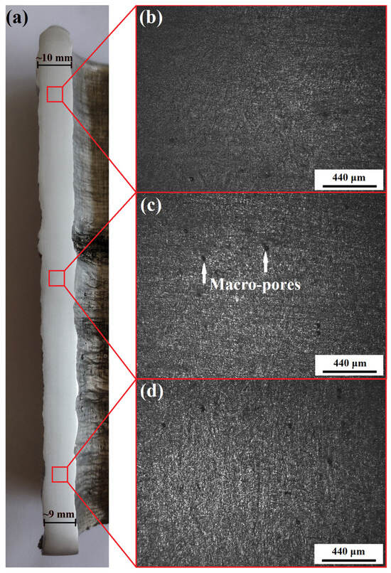 Macroscopic image of the cross-section of the L400 specimen (a) and optical images of the top (b), middle (c), and bottom sections (d) of the same specimen.