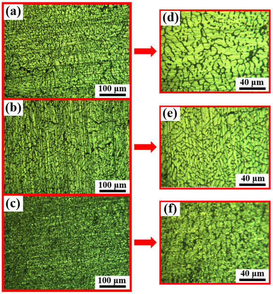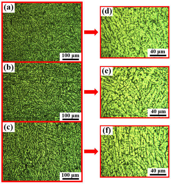 Figure 10 shows optical images taken from the side wall of the L200 specimen at the different stages of build-up. The bottom section of the specimen is depicted in Figure 10c, and a zoomed area of the same sample is shown is Figure 10f. The same approach was used for the middle (Figure 10b,e) and top (Figure 10a,d) sections. Clearly visible eutectic formations consisting of αAl + Si were observed oriented towards the build-up direction of the specimen. A decrease in the concentration of those formations at the top of the specimen and an increase in the size of the aluminum grains were also noticed. The average area of each individual αAl grain at the bottom of the specimen is about 121 µm2, at the middle the values reach 305 µm2, and at the top they are 550 µm2.