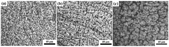 Figure 13 shows optical images taken from the cross-section of the L400 specimen corresponding to the bottom (a), middle (b), and top (c) sections. These images confirm that regarding the L400 specimen, no obvious change in the size of the aluminum grains is observed, and thus no substantial difference in the size and concentration of the eutectic structures.