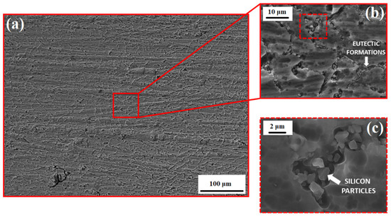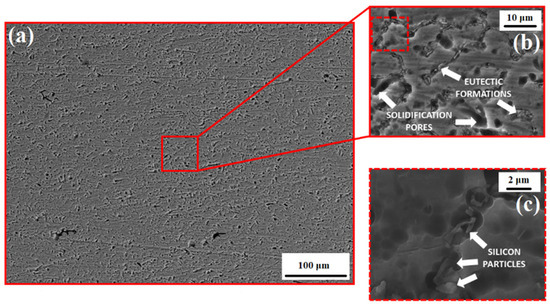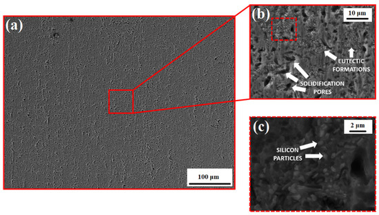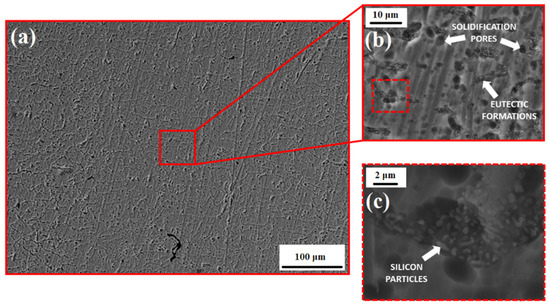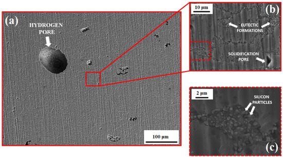 The microstructure of all samples was closely studied using scanning electron microscopy. The results of the experiments are shown in Figure 14, Figure 15, Figure 16, Figure 17, Figure 18 and Figure 19. The bottom section of the L200 specimen was studied and the obtained images are presented in Figure 14. Figure 14a presents a macro image of the studied area, where a large macro-pore is observed. A small quantity of smaller irregularly shaped pores along with some contaminants on the surface are also both observed in Figure 14a,b. A closer inspection of the surface of the sample (Figure 14b,c), a double-phase structure comprised of pure aluminum and αAl + Si eutectic structures, was observed. These structures consist of a mixture of fibrous and irregularly shaped eutectic formations.