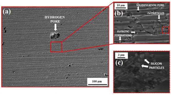 Figure 15a presents a macro image of the studied sample taken from the middle of the L200 specimen. Once again, a macro-pore is observed along with a small quantity of smaller pores. In regard to the microstructure (Figure 15b,c), a double-phase structure of Al and Si is observed. In Figure 15b, a small undissolved Fe particle is observed located amidst the secondary phase.