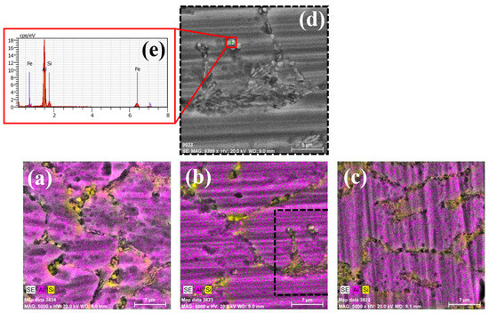Figure 20 depicts the results of the EDX mapping analysis performed at the bottom (a), middle (b), and top (c) sections of the L200 specimen. All images confirm that the observed structures with the optical and SEM analyses are indeed a combination of an αAl phase and a secondary eutectic structure consisting of αAl + Si. A zoomed image of the middle section (Figure 20d) was taken due to the presence of an irregular particle in the structure of the secondary phase. The performed EDX in the area of that particle (Figure 20e) indicates that this particle is made out of iron. The welding wire manufacturer indicates that the welding wire consists of a 0.49 wt% of Fe. The presence of Fe in the structure of aluminum alloys is quite contradictory. Typically, iron is considered as an impurity that plagues aluminum alloys and leads to a worsening of the mechanical properties of the alloys due to the formation of the brittle β-Al5FeSi phase that reduces their ductility [33]. In addition, due to the much higher melting temperature of Fe compared to aluminum and due to the much lower fusion energy of that material, the process of formation of the β-Al5FeSi phase is characterized by a slow solidification speed, such as the one achieved during casting processes [33]. However, despite the arc welding process not having speeds of solidification of the molten pool as high as welding methods that employ high energy fluxes, such as laser beam welding (LBW) [34] or electron beam welding (EBW) [35], the process is still characterized by significantly higher solidification speeds compared to standard processes of specimen formation such as casting [33,36]. This is the reason why the Fe particles observed in the structure of the alloy are in the form of undissolved particles and not in the form of the β-Al5FeSi phase. The iron in the wire uses a secondary phase moderator, which improves the stability of formation of the secondary silicon phase.