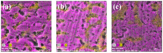 Figure 21 shows the results of the EDX mapping analysis performed for the bottom (a), middle (b), and top (c) sections of the L400 specimen. Once again, a double-phase mixture consisting of a pure aluminum phase and a eutectic αAl + Si structure is observed. The secondary eutectic structure has no detected irregularities in its composition. A high quantity of small pores was observed in this case, confirming the observed tendency in the SEM images of the L400 specimen to have a higher concentration of defects compared to the L200 one.