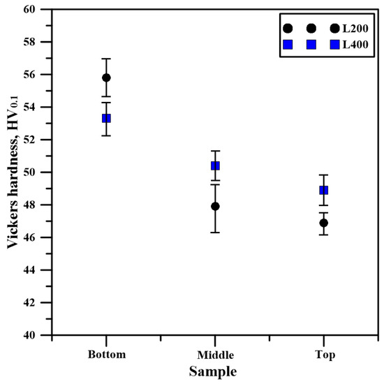 The microhardness according to the Vickers scale is shown in Figure 22. The results presented in it are obtained for specimens of both lengths at different stages of specimen build-up. The lowest obtained value was 46.9 ± 1.1 HV0.1, corresponding to the top section of the L200 specimen. The highest average microhardness value was 55.8 ± 2.5 HV0.1 and it was observed at the bottom of the L200 specimen. Considering the smaller specimen, an obvious decrease in the microhardness was observed following the direction of build-up. Comparably, a decrease in the Vickers hardness of the L400 specimen following the same measuring strategy was observed; however, the observed decrease curve is much flatter compared to that of the smaller specimen. The decreasing character of the microhardness is primarily attributed to the increase in the size of the aluminum grains with the increase in the specimens’ heights. As discussed above, the increase in the size of the grains is much more pronounced in the case of the smaller specimen. Pramod et al. [22] also reported a decrease in the microhardness of an Al4043 CMT+P manufactured circular-shaped specimen. This is in agreement with the current results. In previous studies, the possibility of increasing the microhardness of wall-shaped specimens, manufactured in the cold arc pulse mode with an Al4043 welding wire, with an increase in their height was studied [24]. The results also suggested that the variation in the type of silicon eutectic structures and their concentration in the primary αAl solid solution were highly responsible for the variation in the microhardness.