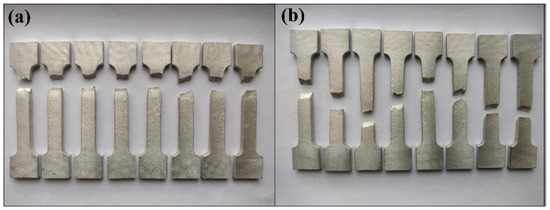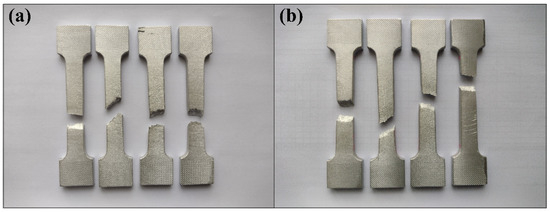 Tensile test samples of the L400 specimen of the (a) vertical and (b) horizontal directions of specimen build-up.