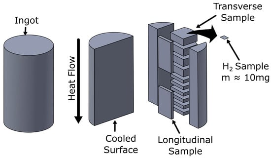 The DS procedure employed in this study enabled the production of an Al-9Sn-1Fe alloy casting experiencing diverse cooling conditions along its length. Samples featuring distinct microstructural length scales were derived from this casting. Subsequently, the produced casting was precisely sectioned into pieces to obtain a set of samples corresponding to various transverse and longitudinal sections. These samples were then subjected to subsequent analysis, as shown in Figure 2. Concentrations of Sn and Fe for three different positions along the length of the casting were traced by using inductively coupled plasma optical emission spectrometry with an Agilent 5100 instrument (Agilent Technologies, Melbourne, Australia).