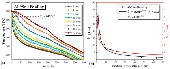 (a) Colling curves acquired at different heights from the bottom of the directionally solidified casting for the Al-9Sn-1Fe alloy; (b) VL and ṪL profiles along the length of the casting.