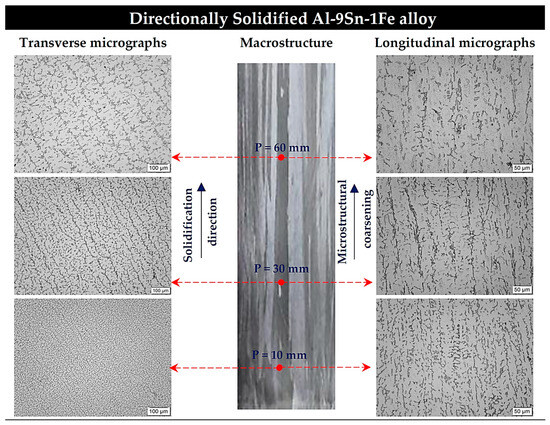 A set of samples was collected along the length of the directionally solidified casting. This was done to investigate the microstructure evolution of the Al-9Sn-1Fe alloy under various thermal histories. Samples were obtained from both transverse and longitudinal sections, which correspond to perpendicular and parallel orientations with respect to the growth direction. An IsoMet 4000 precision cutter (Buehler, Esslingen, Germany) was utilized for the sample extraction.