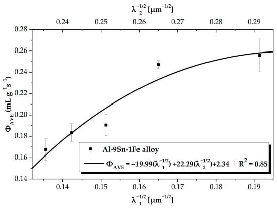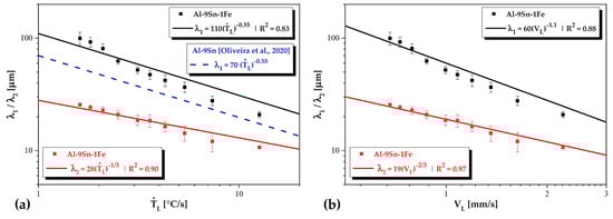 Figure 5 presents the experimental power equations proposed in this study for the growth of λ1 and λ2 of the Al-9Sn-1Fe alloy as a function of VL and ṪL. The exponents were set to be the same as previously reported for several Al-based alloys [34,35,36]. For the relationships of λ1 with VL and ṪL, the exponents were −1.1 and −0.55, respectively. For the relationships of λ2 with VL and ṪL, the exponents were −2/3 and −1/3, respectively. Since the coefficient of determination (R2) exceeded 0.8 for all the obtained equations, it can be inferred that they can satisfactorily represent the experimental scatter. The equation obtained by Oliveira et al. [35] for the evolution of λ1 = f(ṪL) in the Al-9 wt.%Sn alloy is also included. It is noteworthy that for a given ṪL, the addition of 1 wt.%Fe to the Al-9 wt.%Sn alloy resulted in a 57.14% increase in λ1.