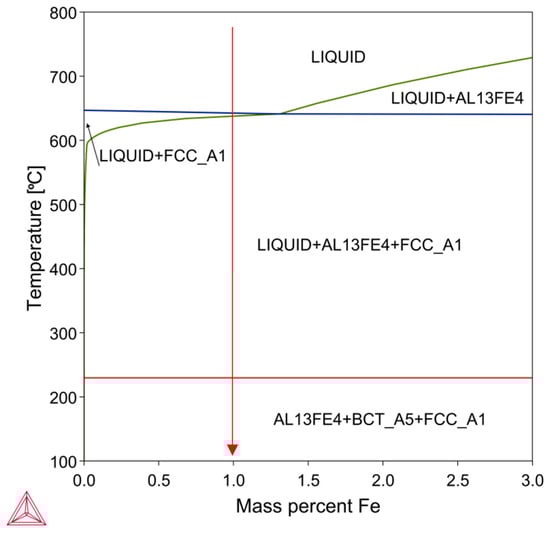 Partial pseudo-binary phase diagram of Al-9Sn-Fe (wt.%) alloys with focus on the region of interest. Red arrow indicates the studied alloy. The lower left corner shows the Thermo-Calc software symbol (Thermo-Calc version 2023a).