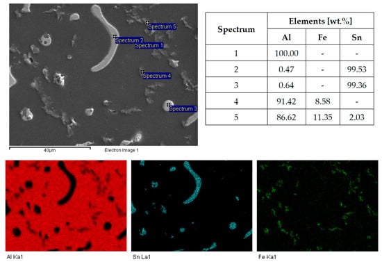 Characteristic SEM images with EDS analysis for the Al-9Sn-1Fe (wt.%) alloy.