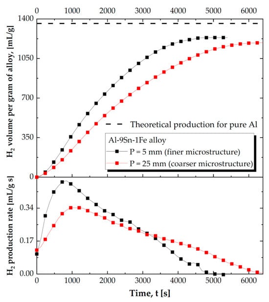 Typical hydrogen production curves and hydrogen production rate profiles obtained for the Al-9Sn-1Fe alloy comparing finer and coarser microstructures; P denotes the position in the casting from which the sample was collected.