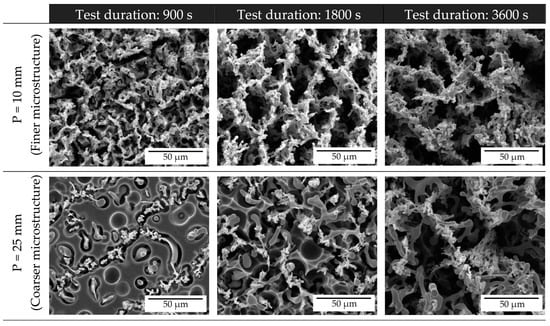 SEM images displaying the microstructural changes in the Al-9Sn-Fe alloy during different durations of hydrogen evolution tests, featuring both finer and coarser microstructures.