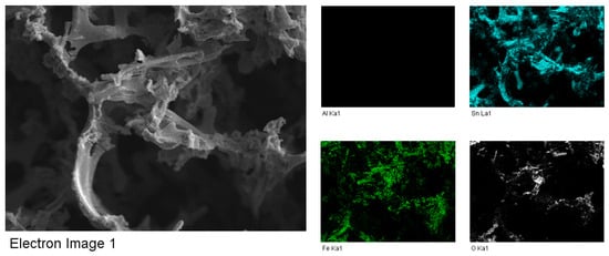 SEM image with EDS mapping illustrating a characteristic structure containing O, Sn, and Fe found in the Al-9Sn-1Fe alloy samples post-hydrogen evolution test.