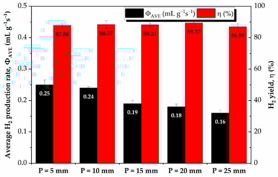 As shown in Figure 11, the microstructural refinement led to a 56.25% increase in . This increase was evident as changed from 0.16 mL g–1 s–1 for P = 25 mm (coarser microstructure) to 0.25 mL g–1 s–1 for P = 5 mm (finer microstructure). Importantly, this enhancement in was achieved without any discernible impact on the hydrogen yield, which consistently maintained a level of approximately 88%.