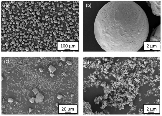 In the present investigations, Argon (Ar)-atomized AISI H11 tool steel powder purchased from TLS Technik GmbH & Co Spezialpulver KG (Bitterfeld-Wolfen, Germany) was used as matrix material. As follows from SEM imaging (Figure 1a,b), the AISI H11 particles had a predominately spherical particle shape and a smooth particle surface. The effective particle diameter of the steel powder ranges from 5 µm to approximately 80 µm, according to particle size distribution studies carried out using a Camsizer system supplied by Retsch GmbH (Haan, Germany). The expected value d50% of the effective particle diameter was determined to be 41.4 µm.