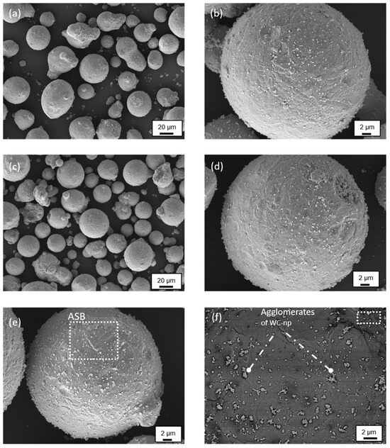 SEM images of the prepared WC-np-enriched H11 powder blends: (a,b) mixture No. 1 (+1 wt.-% of WC-np), (c,d) mixture No. 2 (+2.5 wt.-% of WC-np) and (e) SEM- and (f) angular-selective basckscattering (ASB) image of mixture No. 3 (+5 wt.-% of WC-np).