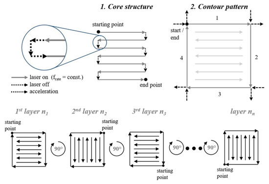 Figure 4 shows a sketch of the bidirectional deposition strategy applied for the AM process of multi-layered builds. The hatch distance that corresponds to the distance of two parallel aligned and overlapped single weld tracks was adjusted to the half single track width, which was measured via OM in advance.