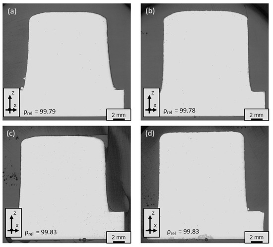 Polished cross-sections for density assessment of (a) the pure AISI H11 sample (ρrel = 99.79%), reprinted from Ref. [44] and the specimens made out of (b) mixture No. 1 (+1 wt.-% of WC-np) (ρrel = 99.78%), (c) mixture No. 2 (+1 wt.-% of WC-np) (ρrel = 99.83%) and (d) mixture No. 3 (+5 wt.-% of WC-np) (ρrel = 99.83%).
