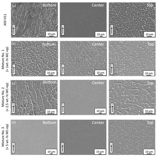 SEM images of etched sample cross-sections at different positions: (a) pure AISI H11, (b) mixture No. 1 (+1 wt.-% of WC-np), (c) mixture No. 2 (+2.5 wt.-% of WC-np) and (d) mixture No. 3 (+5 wt.-% of WC-np).