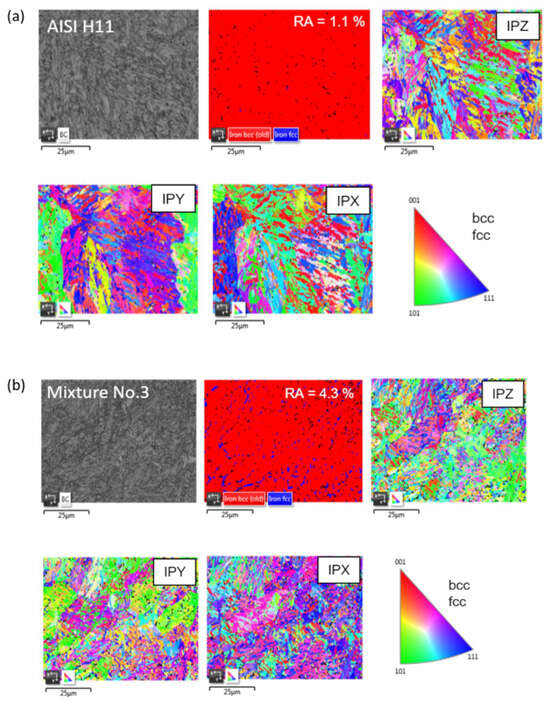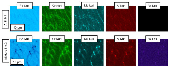 In addition, as demonstrated using EDS area scans, an accumulation of the main alloying elements and carbide formers Cr, Mo, Mn and V was detected in the interdendritic regions or at the grain boundaries independently on the powder mixture examined (see, e.g., Figure 8). In contrast, the iron (Fe) content appears to be reduced and the carbon concentration slightly increased in these areas; cf. Figure A2 and Figure A4. This indicates the formation of hardness- and strength-enhancing carbides, in particular, Cr and Mo mixed carbides of type M7C3 or M23C6 and VC and Mo2C special carbides. These observations are also in good agreement with the results of others who have investigated the processing of AISI H11 or similar hot work tool steels using laser-based Additive Manufacturing processes such as LPBF-M [29] and DED-LB/M [10].