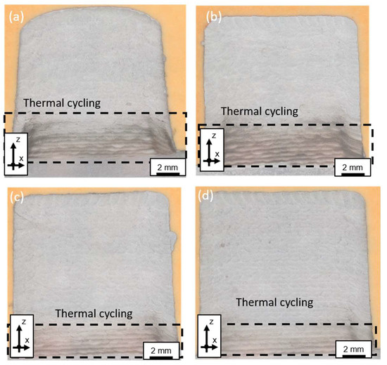In advance to the thermal post processing, the steel plates on which the builds were deposited were machined to form specimens consisting of the 30-layer test specimen and a cuboidal piece of the tool steel substrate (Figure 3 (right)). To ensure that the thermal boundary conditions for all the specimens during the heat treatments were approximately the same, they had approximately the same mass and a very similar geometry after machining.