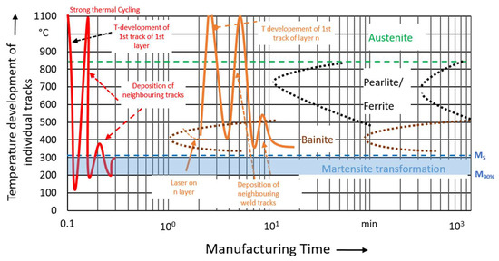 Most studies are concerned with the processing of low-carbon steels. Examples of these are stainless steels [10,11,12] or maraging steels such as, e.g., Fe-19Ni-xAl [13], 1.6358 [14], or 1.2709 [15,16], which are considered to have good weldability due to their low carbon content and are therefore suitable for processing in laser-based Additive Manufacturing. Further works are investigating the processing of more traditional hot work tool steels such as AISI H13 [17,18,19,20] or AISI H11 [21] whose carbon content is between 0.3 and 0.4 wt.-% [22]. These steels are commonly used as materials for injection molds or forging dies in industry. For this purpose, they are usually produced by machining and applying a series of different subtractive manufacturing technologies followed by depositing a functional coating.