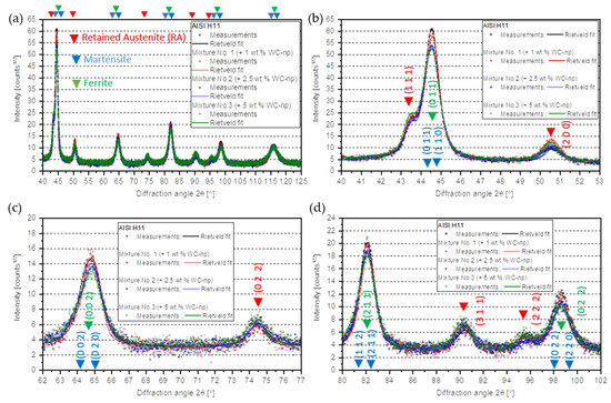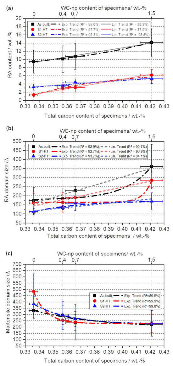 As suggested in [44], the crystallite size (domain size) of martensite and RA can be determined by analyzing the influence of the WC-np on the full width at half maximum (FWHM). A broadening of the FWHM of individual peaks is due to either a decrease in domain size or an increase in micro-stress within the crystallites. The RA content and the domain size of RA and martensite were then obtained as model parameters of the Rietveld approach directly in the software.