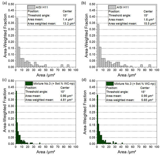 At this stage, it should be noted that all combinations of process parameters are applicable to the production of almost fully dense multilayer specimens made from both unmodified AISI H11 powder and AISI H11 powder blends enriched with carbon black nanoparticles [18,44].
