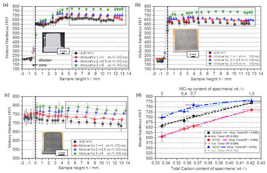 Comparing the total carbon content of the powder blends (Table 2) with the carbon concentration of the 30-layer specimens produced using the WC-np-enriched AISI H11 powder blends (Table 4), it is clear that there is a loss of carbon in the DED-LB/M process. The loss of carbon can ultimately be attributed to a loss of WC-np during the transport phase of the powder blends from the powder feeder to the laser-induced melt pool. In particular, larger agglomerates consisting of a few WC particles, as shown in the SEM and ASB images in Figure 2e,f, detach more easily from the surface of the microscale AISI H11 particles during the transport phase than is the case for small isolated WC particles. The reason for this is that the electrostatic force (van der Waals force) responsible for the adhesion of the WC nanoparticles to the surface of the AISI H11 particles decreases significantly with an increasing effective particle diameter and mass of the WC-np agglomerates. On the other hand, carbon loss through evaporation of the WC nanoparticles introduced into the process is excluded due to the high boiling temperature of WC of about 6000 °C.
