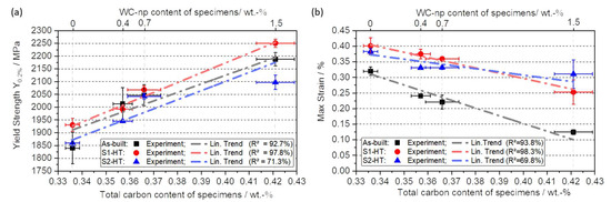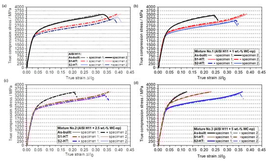 Compression tests were conducted following DIN 50106 to investigate the impact of added WC-np on compression properties. The Quasar 100 universal testing machine from Galdabini (Cardano al Campo, Italy) was used for this purpose. As depicted in Figure 5c, the cuboid specimens underwent a series of subtractive manufacturing processes, including wire-EDM, turning and circular grinding, to transform them into cylindrical compression specimens with a diameter of 6 mm and a height of 9 mm. The material testing was conducted under a maximum compression force of 100 kN, which corresponds to the maximum load capacity of the universal testing machine. The compression rate was set to a constant value of 5 mm/min, which is an empirical value. The Y0.2% compressive yield strength, maximum compressive stress and maximum achievable strain were determined by examining and evaluating the recorded stress–strain curves. To ensure statistical significance, five specimens were tested and characterized for each steel powder mixture and heat treatment condition (as-built, S1-HT and S2-HT).