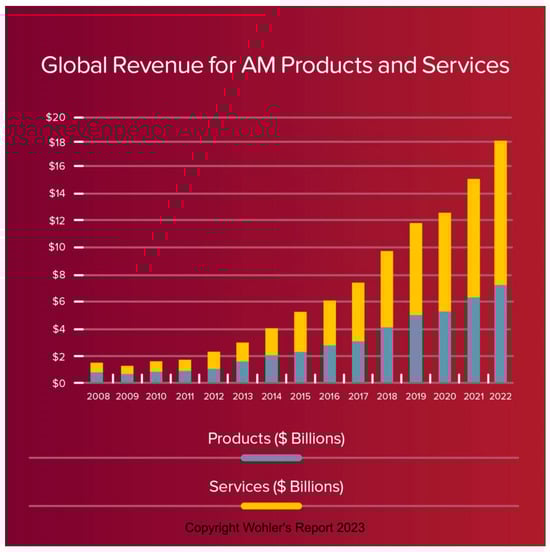 The Fourth Industrial Revolution, also known as Industry 4.0, has radically transformed the manufacturing sector [1]. Globally, there has been a shift to embrace the ongoing trend of mechanical automation in conventional production processes, resulting in the emergence of intelligent production [2]. This is one of the most extensively researched topics in modern times. Cyber-physical systems and the integration of physical processes, storage systems and manufacturing equipment that autonomously exchange information and monitor each other are at the heart of Industry 4.0 [3,4]. Additive manufacturing techniques are considered to be one of the components of modern production [4,5,6,7]. According to the ISO/ASTM 52900:2021 international standard, the definition of additive manufacturing is as follows: “the process of joining materials to make parts from 3D model data, usually layer by layer, as opposed to subtractive and formative manufacturing processes” [8]. The first mentions of 3D printing techniques date back to the 1980s [9]. From the beginning, this type of manufacturing has been used to produce a wide range of components. The graph in Figure 1 is taken from a report by Wohlers Associates, one of the largest organizations focusing on additive techniques, published in 2023 [10]. It illustrates the total cost of components and services produced using additive manufacturing techniques in recent years. It shows a significant increase in the importance of the manufacturing techniques under review. These products are used in a wide range of industries, from automotive to aerospace, medical, electronics, defense, etc. The breakdown described is shown in Figure 2 [11].