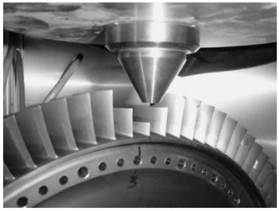Directed energy deposition (DED) is another type of additive manufacturing technique that works with metals. DED covers 16% of the metal AM market [39]. The printing machine’s head applies successive layers in the form of powder (powder DED) or wire (wire DED). With the help of a laser (LW-DED), electron beam (EB-DED), or electric arc (AW-DED), the material goes into a liquid state and deposits successive layers of the target part [40,41,42]. In most cases, a shielding gas (usually argon) is used to prevent the atmosphere from reacting with the liquid metal and forming metal oxides, which could negatively affect the structure of the material [43]. These techniques enable the production of large parts using advanced materials, such as stainless steels, titanium, or Inconel alloys, which have favorable performance properties. The mentioned techniques not only enable the complex production of components from basics, but also allow for equipment regeneration and damaged component repair [44,45,46,47]. The primary goal of a specific procedure is to reproduce a component’s original geometry and properties using only an additive manufacturing process [48]. A laser is used to weld the material and determine the material structure, which affects the mechanical properties of the product. Figure 6 presents an example of the remanufacturing process for repairing a key part of a jet engine rotor, specifically its blades. Despite the high degree of freedom in remanufacturing the components in question, in many cases post-processing is required. This is due to the high surface roughness.