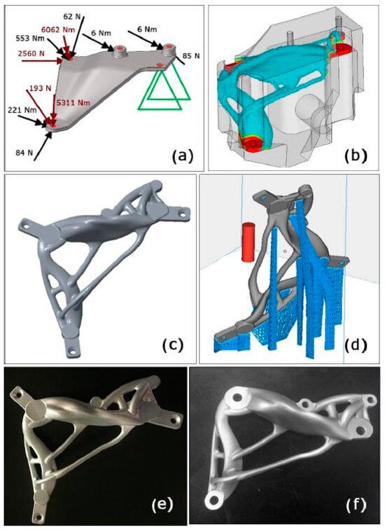 Process of manufacturing electric engine bracket: (a) original bracket load cases, (b) geometry from the topology optimalization process, (c) final geometry, (d) part in SLM 125 machine software, (e) stock part after L-PBF process, (f) finished part. Reproduced from Reference [110].