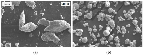 The alloys Mg95–Zn5, Mg90–Zn10, and Mg85–Zn15 (% by weight) were manufactured using the mechanical alloying (MA) technique. The raw materials in this experiment were Mg and Zn powders with average diameters of around 40.0 μm and 15.0 μm (Figure 1) and a purity of 99.8% and 99.6%. The powder obtained through mechanical alloying was uniaxially compacted into a cylindrical die using a hydraulic press at a pressure of 500 MPa and with a residence time of 5 min. A green compact 0.0127 m in diameter was obtained, which was then sintered in an argon atmosphere at 400 °C, obtaining solid and rigid samples for subsequent ionic nitriding for 5 h to improve the properties of the Mg–Zn alloys. Vickers microhardness (HV) tests were carried out on the Mg–Zn alloys and nitrided samples, applying a load of 0.2 kg with a time of 25 s.