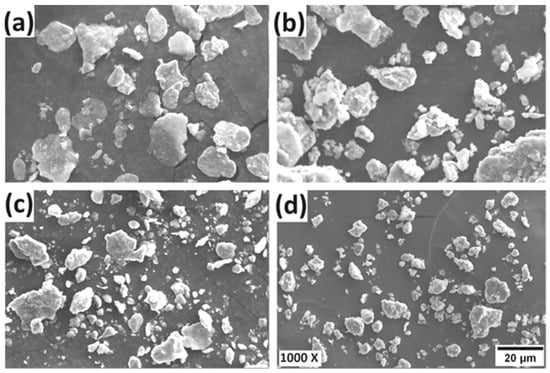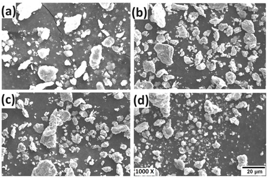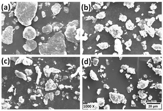 Figure 2, Figure 3 and Figure 4 show the size and morphology of the particles as the grinding time is increased. SEM micrographs (Figure 2d, Figure 3d and Figure 4d) of the Mg95–Zn5, Mg90–Zn10, and Mg85–Zn15 powders reveal that next 15 h of grinding, two kinds of deformation mechanisms during milling can be observed: ductile deformation, where flat particles are formed through elongation; and brittle deformation, which outcomes in the formation of angular and irregular particles typical of brittle materials.