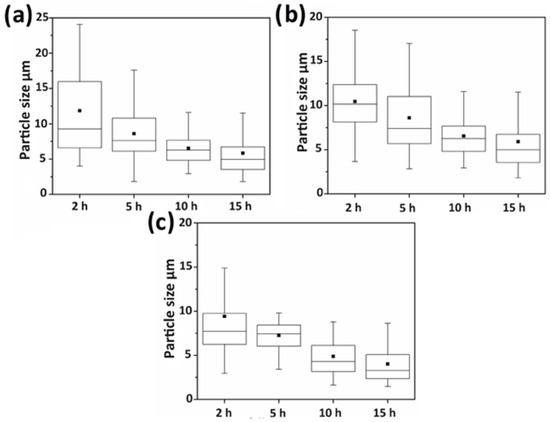 Particle size evolution of (a) Mg95–Zn5, (b) Mg90–Zn10, and (c) Mg85–Zn15 for 2, 5, 10, and 15 h of milling time.