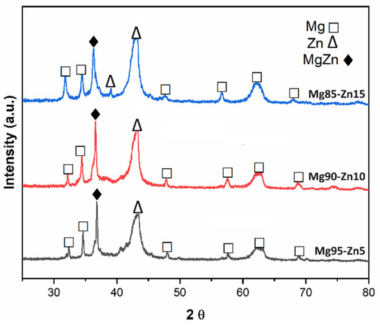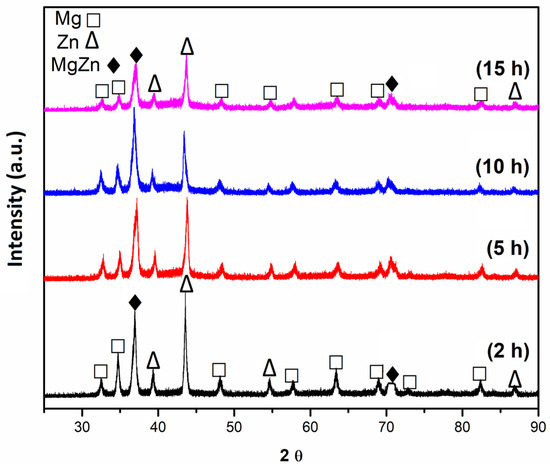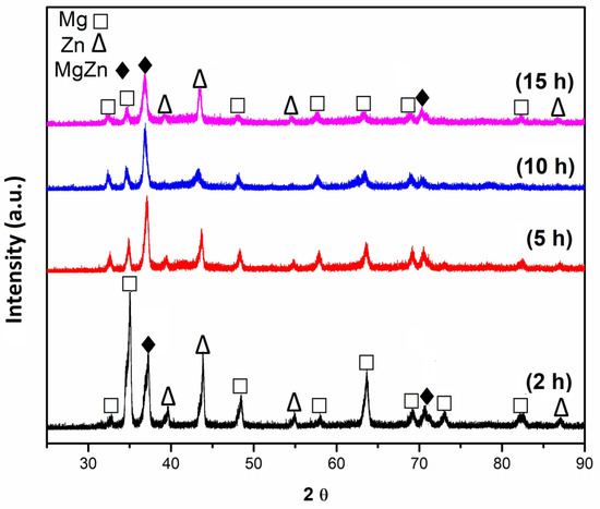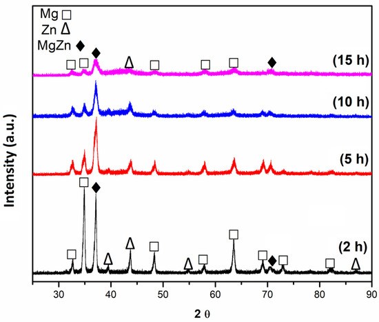 Figure 2, Figure 3 and Figure 4 show that the particle size decreases with the increase in milling time. The variation in particle size could be attributed to different amounts of plastic deformation and fractures produced in the mechanical milling process. In general, the strength and hardness of the Mg–Zn alloys increase with increasing Zn concentration [41], facilitating better fragmentation of the zinc particles in magnesium during grinding. On the other hand, when the alloy contains a large amount of Mg—that is, a low concentration of Zn—the ductility of the system will be high, and, therefore, particle fragmentation is hindered. Therefore, the particle size decreases with the increasing Zn concentration of the alloys.